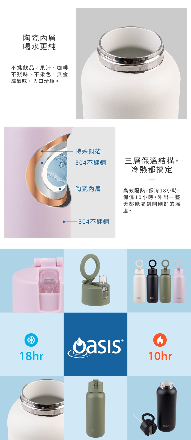 瓶身採用三層保溫結構,內層陶瓷塗層保留飲品原味,無金屬氣味、不殘色。