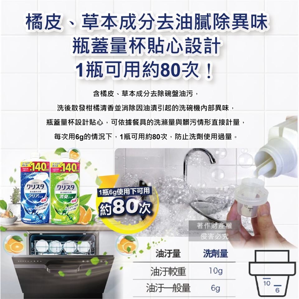 (2)使用標準量比例:以洗碗機大小約5~7人份容量(餐具約40~50個)的情況,一般髒污情況倒入約6g洗劑;髒污多的情況倒入約10g洗劑。