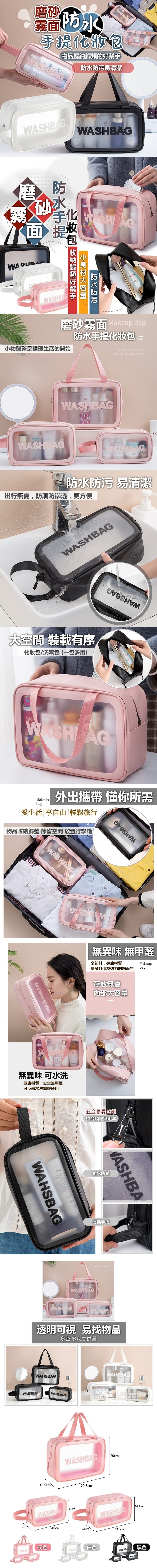磨砂半透明化妝包,透明可視,超大收納空間,大開口設計,物品拿取方便,簡約時尚外觀,防塵防水材質,洗漱不怕用濕,極強防水效果,金屬拉鍊,滑順開合不卡頓,精緻車縫線,美觀耐用,舒適提帶設計,便攜好拿