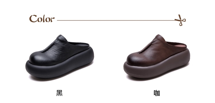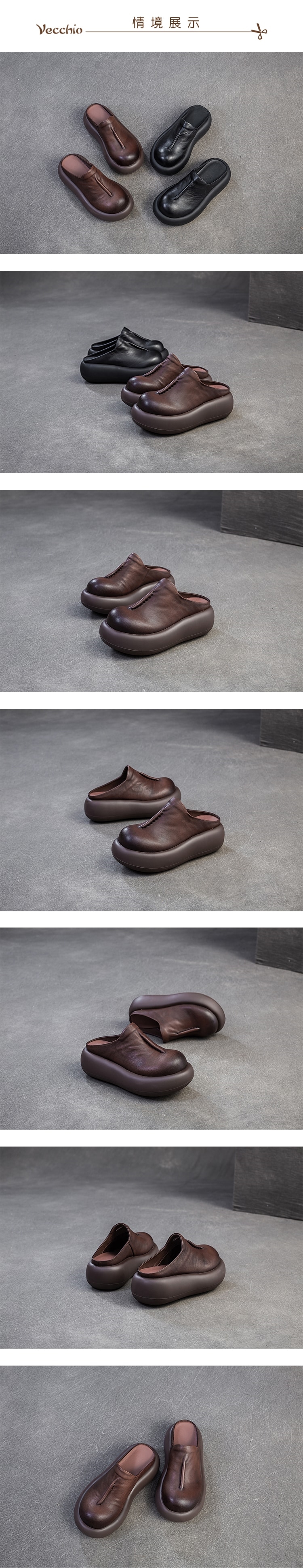 【VECCHIO】真皮抓褶厚底包頭拖鞋/真皮頭層牛皮復古抓褶舒適大圓頭輕量厚底包頭拖鞋 女鞋 咖