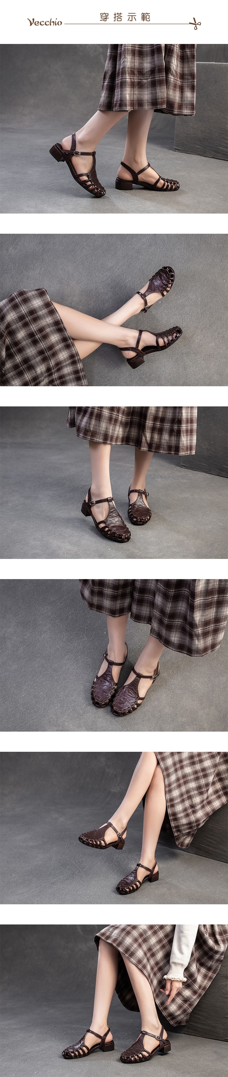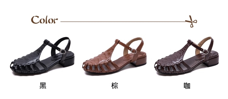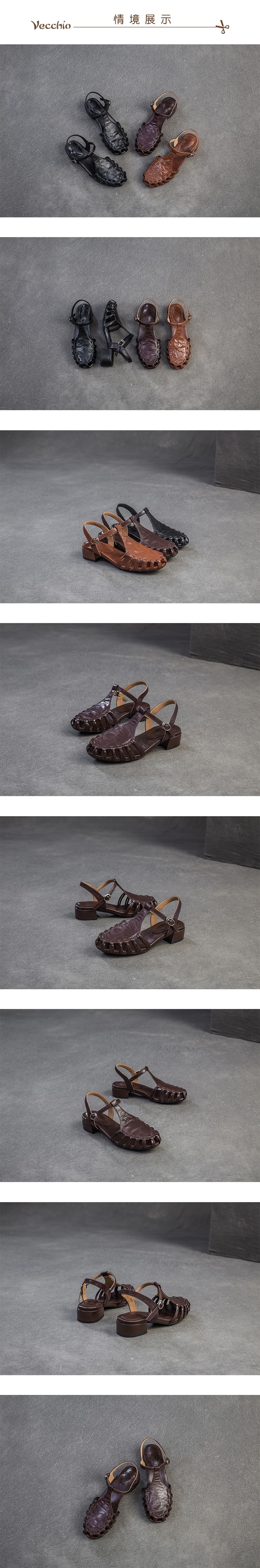 【VECCHIO】羊皮編織包頭粗跟涼鞋/真皮細緻羊皮復古縷空編織包頭粗跟涼鞋 女鞋 咖