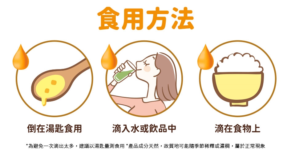 每日1滴,可直接滴於口中或滴於食物或飲品中食用。