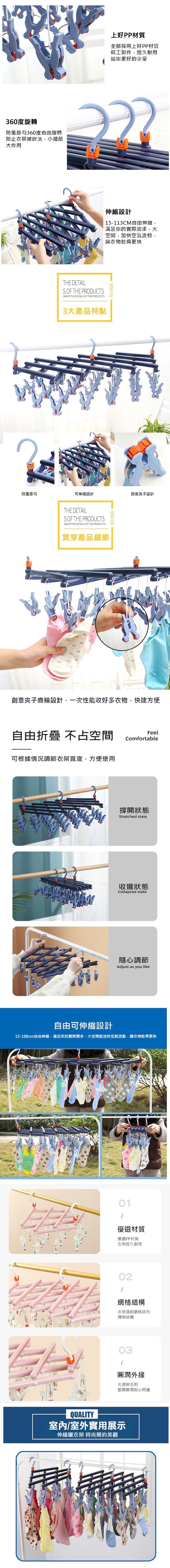 滾輪式夾子設計,秒收曬衣夾,不傷衣物,衣架可自由摺疊,不佔空間,360度可旋轉掛勾,可隨風向旋轉,方便懸掛,29夾頭,方便一次晾曬多種衣物的需求,衣架頂部網格排列,衣架結構穩固