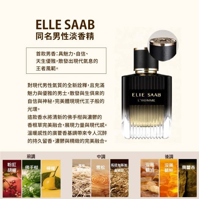 這款男香是ELIE SAAB眼中的男性象徵:具魅力、自信、天生優雅,散發出現代氣息的王者風範,一位現代王子,神秘的個性在光與影之間流轉。