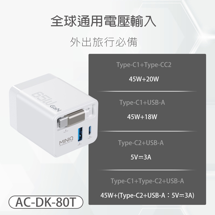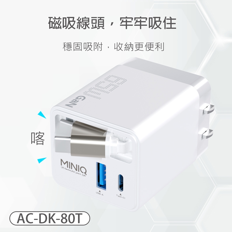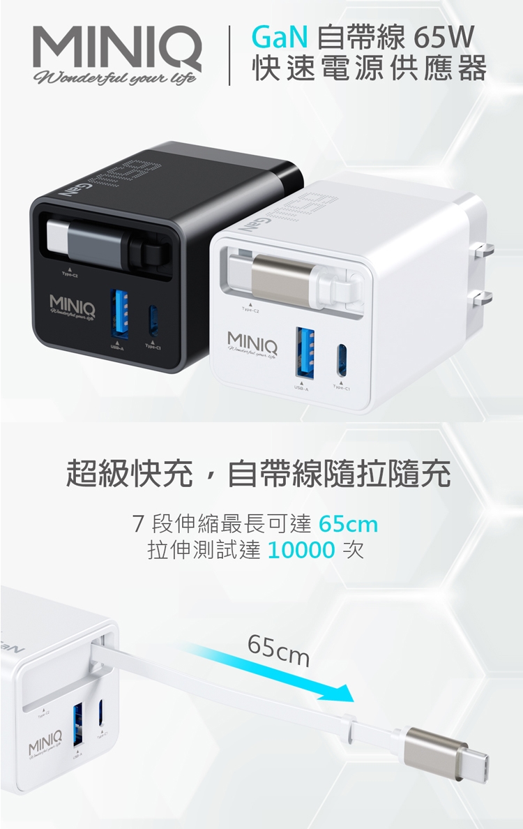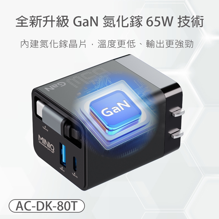 MiniQ AC-DK80T 65W氮化鎵自帶Type-C伸縮線 快速充電器
