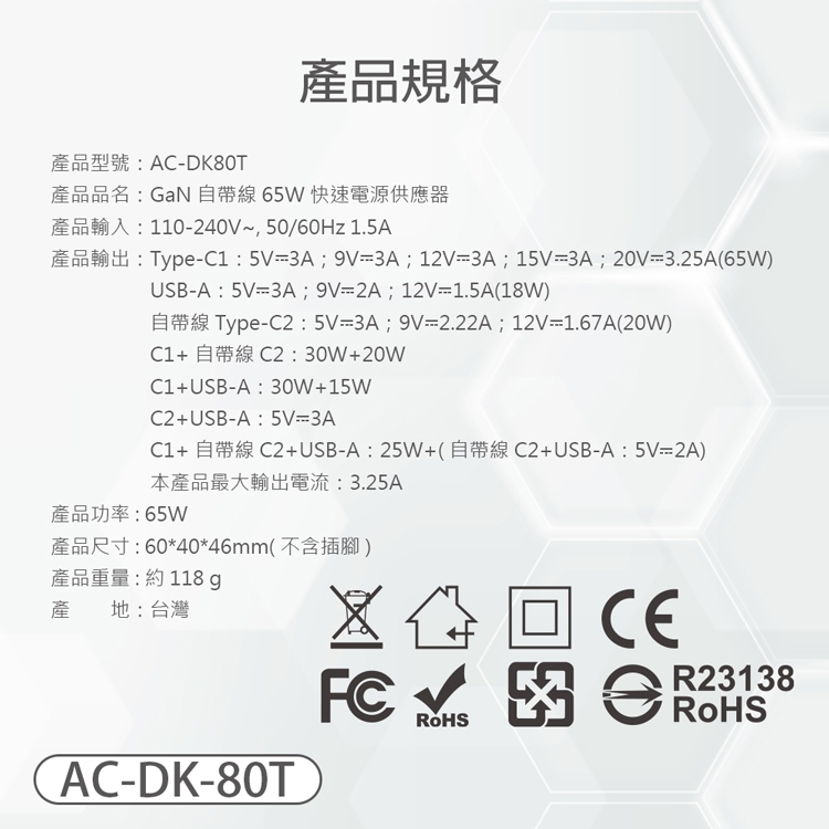 產品輸出:Type-C1 : 5V=3A ; 9V=3A ; 12V=3A ; 15V=3A ; 20V=3.25A(65W)