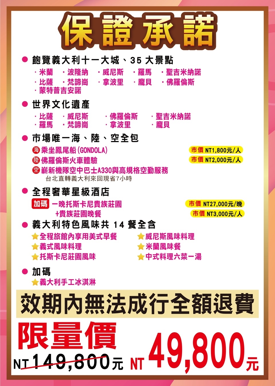 ※五百萬履約保障險、兩百萬旅遊契約責任險及二十萬元意外醫療險。