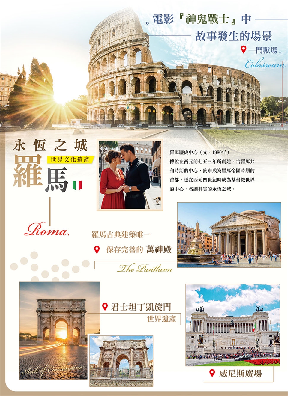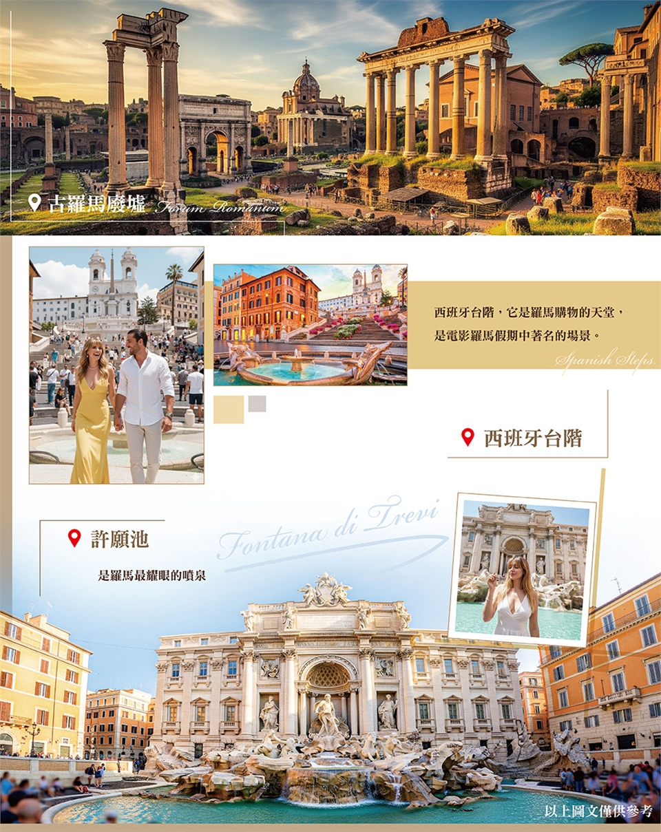 早餐後前往天主教勝地【梵諦岡教皇國】,國土面積雖然只有44平方公里,大約台北市1/6大,卻是全球近10億天主教徒的信仰中心,影響範圍無遠弗屆,在拉丁語中意為“先知之地”。1870年義大利統一後,教皇被迫退居羅馬城西北角的梵蒂岡宮中。1929年,義大利承認梵蒂岡為主權國家,其主權屬教皇,梵蒂岡為中立國,其國土神聖不可侵犯。在梵蒂岡處處都是歷史與珍貴古跡遺產,而聖彼得大教堂建築本身更是世界的藝術遺產,內的聖彼得大教堂費時一百五十年才建成,更是舉世無雙的。這座全世界最大的教堂也是梵蒂岡的象徵,5座紫銅大門最右邊的一座為「聖門」,只有每隔25年一次的「大赦年」才由教宗開啟。爾後驅車前往永恆之都【羅馬】。進行市區觀光:參觀屬於【羅馬】的榮耀與驕傲,將羅馬古典建築唯一保存完善的萬神殿;許願池是羅馬最耀眼的噴泉;電影『神鬼戰士』中故事發生的場景─鬥獸場,憑藉著現在的遺跡,想像它昔日的輝煌面貌;西側的君士坦丁凱旋門、古羅馬廢墟、宛如一座露天博物館呈現在您眼前;西班牙台階,它是羅馬購物的天堂,是電影羅馬假期中著名的場景,更因為這裡是西班牙大使館而得名,廣場周圍名店街,咖啡館林立。感受這個由現代與過去歷史交織成的軌跡,所造就的永恆之都-羅馬,領略古都的魅力所在。擁有2,500年歷史,自古以來一直是歷代王朝的國都,綻放傲人光芒的城市的「永恆之城」羅馬歷史名勝。 早餐:飯店內早餐 午餐:方便遊玩敬請自理 晚餐:中式料理六菜一湯 |