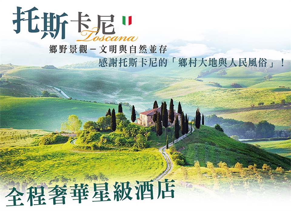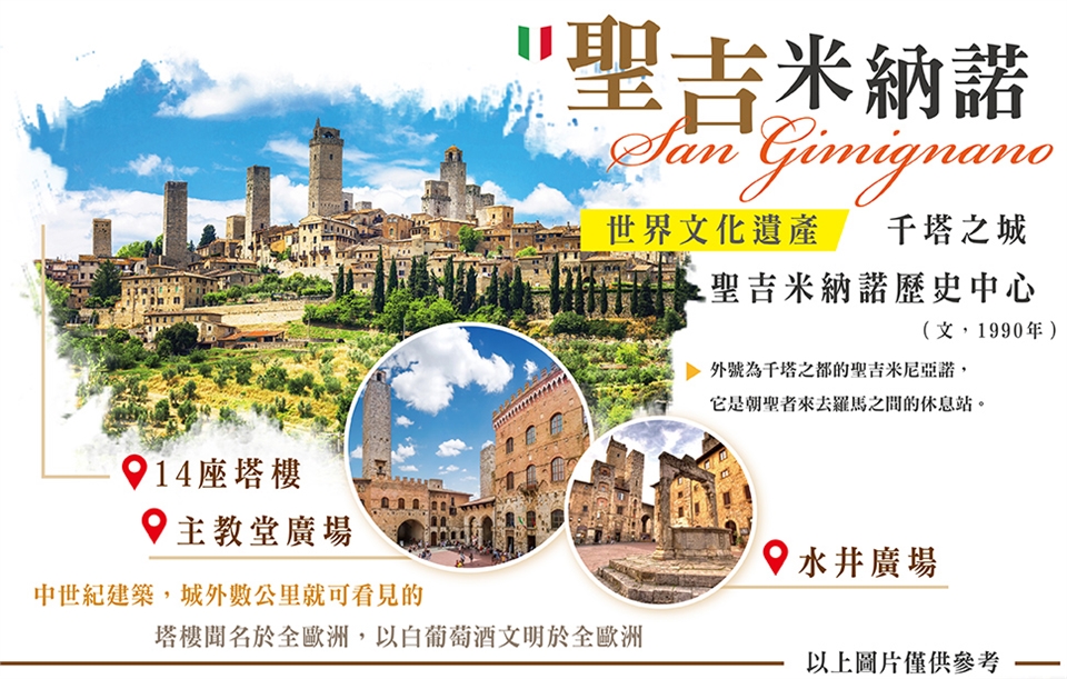 早餐後,我們行經托斯卡尼的丘陵、山坡、果園,踏著美麗的鄉野村落、伴著如畫的山巒谷地,前往有美塔之城(Città delle belle torri)之稱的中世紀古城─【聖吉米納諾】,以城外數公里就可看見的塔樓聞名。在12~14世紀的全盛時期,共有76座塔樓,不過繁榮卻在1348年黑死病襲擊歐洲而告終,迫使它的地位屈從於佛羅倫斯,到現在,只殘存著14座高塔。不過,這完全不損它美塔之城的名號,添上歲月痕跡的塔樓,更具有歷史悠久的況味,在西元 1990 年並被聯合國教科文組織列為世界文化遺產。我們將參觀Collegiata 教堂、Sant'Agostino教堂、水井廣場、主教座堂廣場…有點閒暇時間,絕對不能錯過品嘗連續多年得到世界冰淇淋獎的「GELATERIA DI PIAZZA」。隨後,專車前往暮光之城─新月的拍攝地點【蒙特普吉安諾】,這座中世紀和文藝復興風格的山城海拔605公尺,位於高高的石灰岩山脊上,延著山城蜿蜒的石板路,回憶起電影中各個大小場景,此地同時也是著名的托斯卡尼釀酒之城,不但有14世紀建造的酒窖,更可以在許多酒鋪試喝紅酒,或步行到城牆邊、將葡萄園美景盡收眼底。 早餐:飯店內早餐 午餐:方便遊玩敬請自理 晚餐:中式料理六菜一湯 |