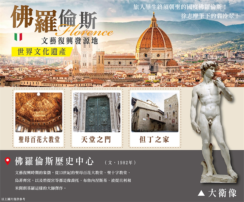 早餐後出發前往【佛羅倫斯】,旅人畢生終須朝聖的國度─徐志摩筆下的翡冷翠(Firenze)!「梅迪奇家族」統治佛羅倫斯三百年,並贊助藝術家豐彩了文藝復興時代的光芒,「美麗,總有緣起!藝術,也有開端!」謙虛地回到您可靜靜地立足觀看中世紀最偉大的情緒感動,市政廳廣場上的大衛像遙望著旅人匆忙的心情,數百年來的喧擾人潮於眼前掠過!聖母百花教堂(Cattedrale di Santa Maria del Fiore)是佛羅倫斯的地標性建築. 其磚紅色的圓頂不僅造型優美,建造圓頂所使用的工法技術更是卓越!◎洗禮堂精緻的◎「天堂之門」引領著人們的卑微!閒暇之餘您可自由閒逛於充滿文藝氣息的市區,選購佛羅倫斯皮件精品,以及LV、Prada、Gucci等各大名牌商品,之後前往托斯卡妮莊園旅館。 早餐:飯店內早餐 午餐:方便遊玩敬請自理 晚餐:莊園飯店晚宴 |
