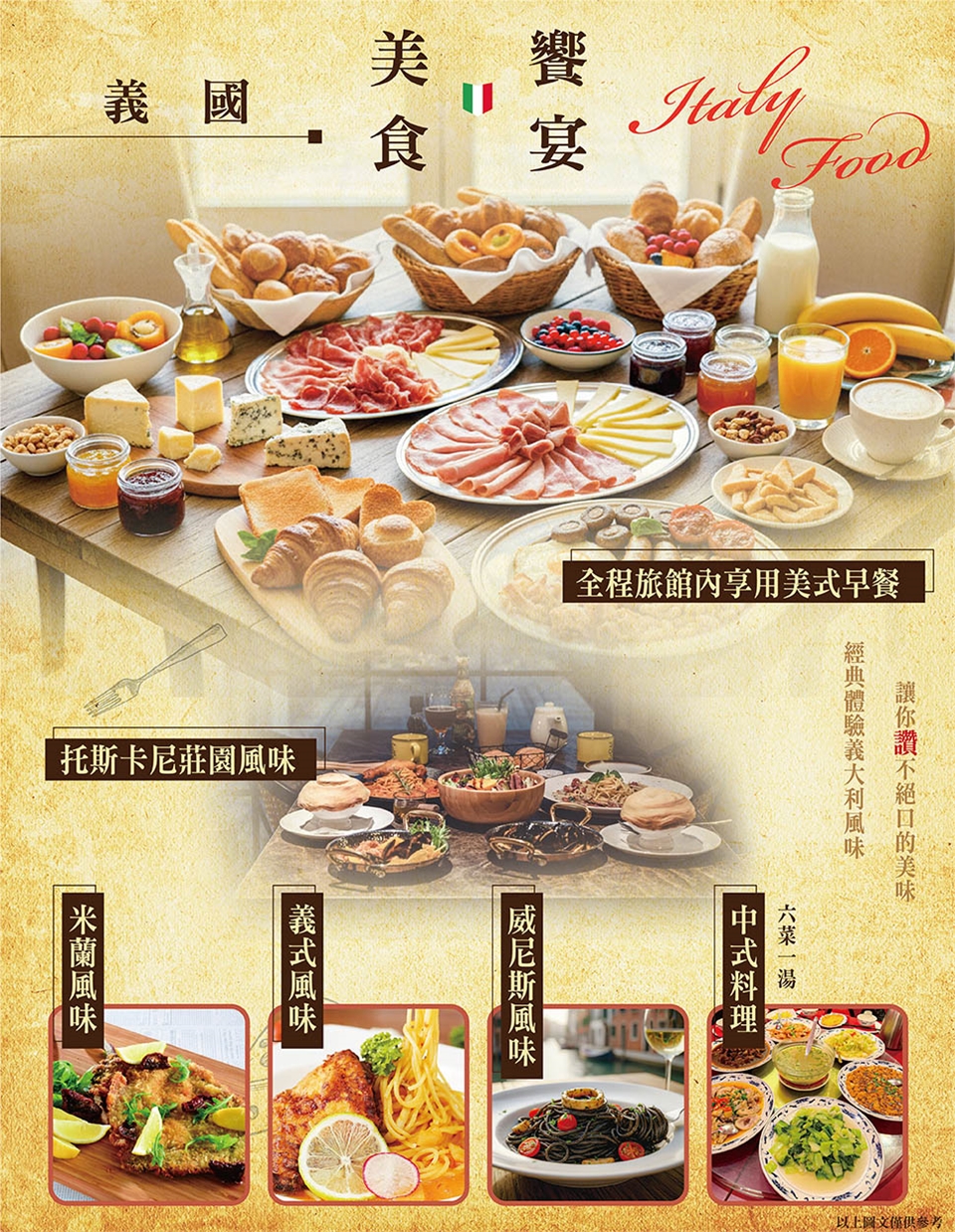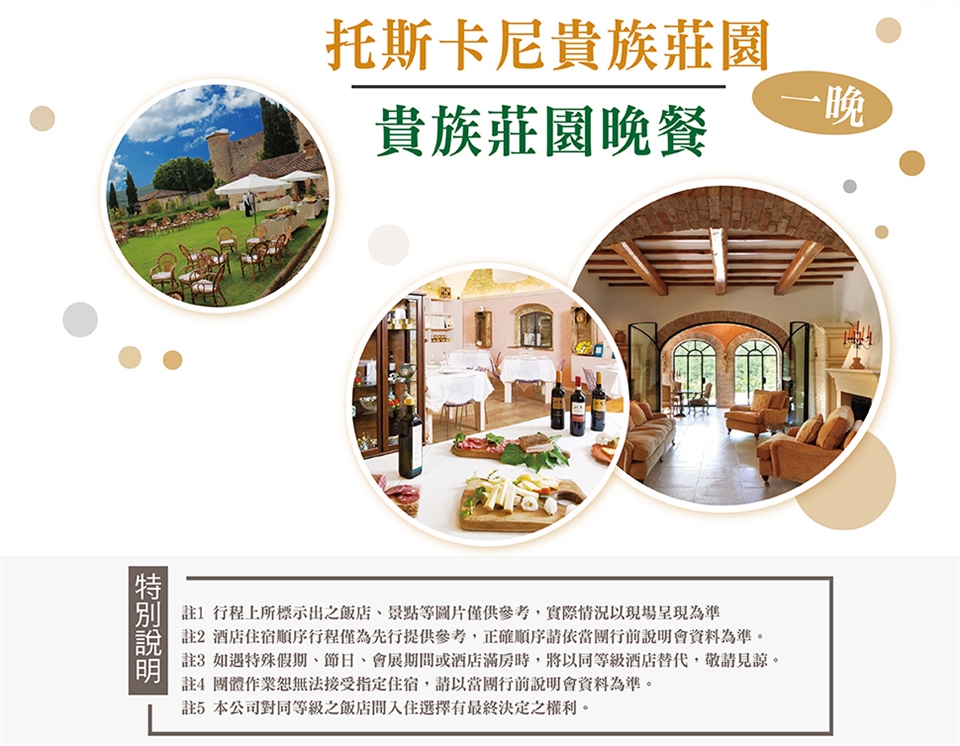 ‧本行程交通住宿及旅遊點儘量忠於原行程,若遇特殊情況將會前後更動或更換觀光景點;遇季節性變化或有餐食變更之情形,本公司將保有變更行程及餐食內容之權利