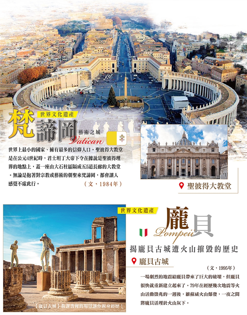 【龐貝古城】(距羅馬240公里) 龐貝於西元前600年左右在義大利沙諾河畔的一個小丘上建城。這個地方當時已經成為希臘人和腓尼基人的良港。當時當地的希臘人非常強大。前5世紀薩姆尼特人佔領龐培和附近地區。龐貝的建築受到薩姆尼特人非常深的影響。薩姆尼特人還擴大了這座城市。前89年,羅馬當權者蘇拉的軍隊包圍龐貝,前80年,羅馬佔領龐貝,龐貝成為羅馬的一個殖民地。由於龐貝是一個良好的海港,而且位於交通要道亞壁古道的附近,因此它很快就成為一個興旺的商業城。63年,一場劇烈的地震給龐貝帶來了巨大的破壞,但龐貝很快就重新建立起來了。79年在經歷幾次地震等火山活動徵兆的一週後,維蘇威火山爆發,一夜之間將龐貝活埋於火山灰下。【拿波里市區觀光】那不勒斯(又譯那波利、拿坡里;義大利語:Napoli;那不勒斯語:Nàpule;英語:Naples)是義大利南部的第一大城市,坎帕尼亞大區以及那不勒斯省的首府。城市面積117平方公里,人口略低於100萬。那不勒斯都會區有大約380萬人人口,是僅次於米蘭和羅馬的義大利第三大都會區[2]和歐洲第15大都會區[3]。那不勒斯地區也是義大利人口最稠密的地方。那不勒斯位於那不勒斯灣的北岸,其東西兩側分別是兩個火山區域:維蘇威火山和坎皮佛萊格瑞火山區。因此,該市自古至今不斷受到火山活動和地震的威脅。那不勒斯以其豐富的歷史、文化、藝術和美食而著稱,那不勒斯歷史中心被聯合國教科文組織列為世界文化遺產。比薩餅起源於那不勒斯。音樂是那不勒斯文化中產生了廣泛影響的的一個重要組成部分,包括發明了浪漫吉它和曼陀林,以及對歌劇和拿波里民謠的重大貢獻。在其存在的2500餘年歷史中,大部分時間都扮演著重要角色。該市為古希臘人所創建,在「大希臘」中扮演重要角色;後來,羅馬人、諾曼人和西班牙人都在該市留下了自己的印記,也曾經是波旁王朝統治的兩西西里王國的首都,直到義大利統一。今天,那不勒斯仍是繁榮的地中海港口和商業城市,高速鐵路和地鐵網伴隨著都會區的擴張。另一方面,黑手黨組織克莫拉繼續困擾著居民的生活,妨礙經濟與社會的發展。 早餐:飯店內早餐 午餐:方便遊玩敬請自理 晚餐:中式料理六菜一湯 |