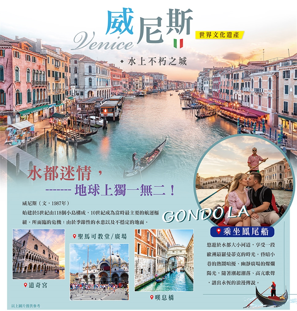 早餐後驅車前往碼頭,搭船前往水都【威尼斯】,展開「威尼斯水都迷情之旅!有著150條運河、400餘座橋樑縱橫交織,讓多少文人墨客、旅人情侶心蕩神馳、心嚮往之!我們將遊覽拜占庭式典型之作的◎聖馬可大教堂、仰望◎鐘樓、◎鐘塔在萬千隻祥鴿飛翔中聳立。威尼斯共和國總督的居所◎道奇宮、◎嘆息橋的歷史陳跡,令人扼腕長嘆,更有那冶鍊玻璃藝術精品的◎水晶玻璃工廠,使這水天相連的都市,在您心頭永難隕滅。隨後享有餘暇,特別安排搭乘★搖櫓船(六人一艘),悠遊於水都大小河道,享受一段歐洲最羅曼蒂克的時光。昏暗小巷的熱鬧喧擾、幽靜廣場的燦爛陽光,隨著潮起潮落、高亢歌聲,譜出永恆的浪漫傳說。 早餐:飯店內早餐 午餐:方便遊玩敬請自理 晚餐:波隆納風味 |