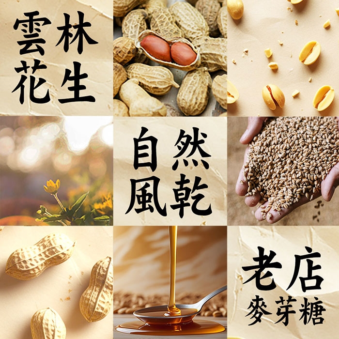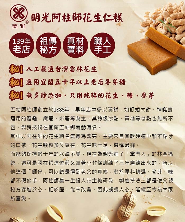明光阿柱師嚴選飽滿花生,家傳古老配方,只用純粹的花生、糖、麥芽攪拌成軟Q糕點,
