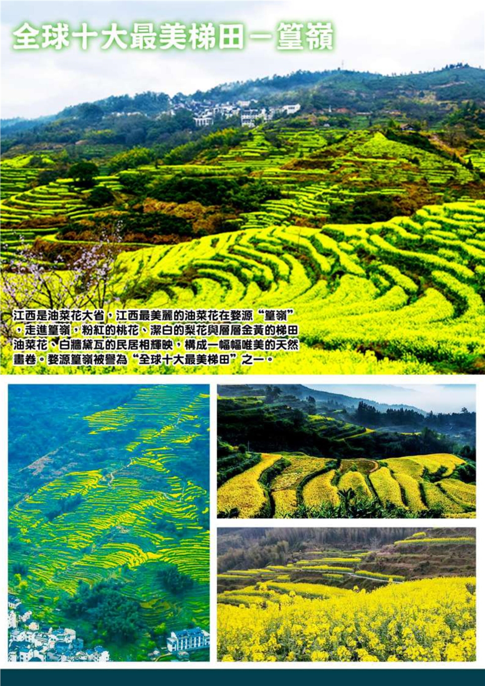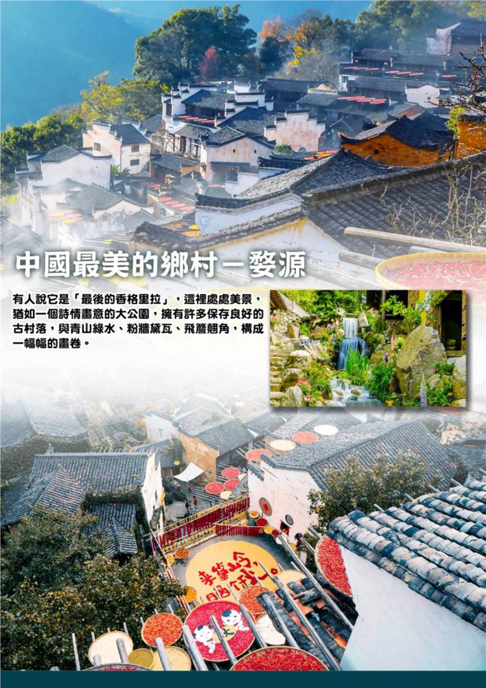【中國最美的鄉村-婺源】也有人說它是「最後的香格里拉」,這裡處處美景,猶如一個詩情畫意的大公園,擁有許多保存良好的古村落,與青山綠水、粉牆黛瓦、飛簷翹角,構成一幅幅的畫卷。 早餐:酒店內 午餐:江西本幫菜 晚餐:婺女風味 |