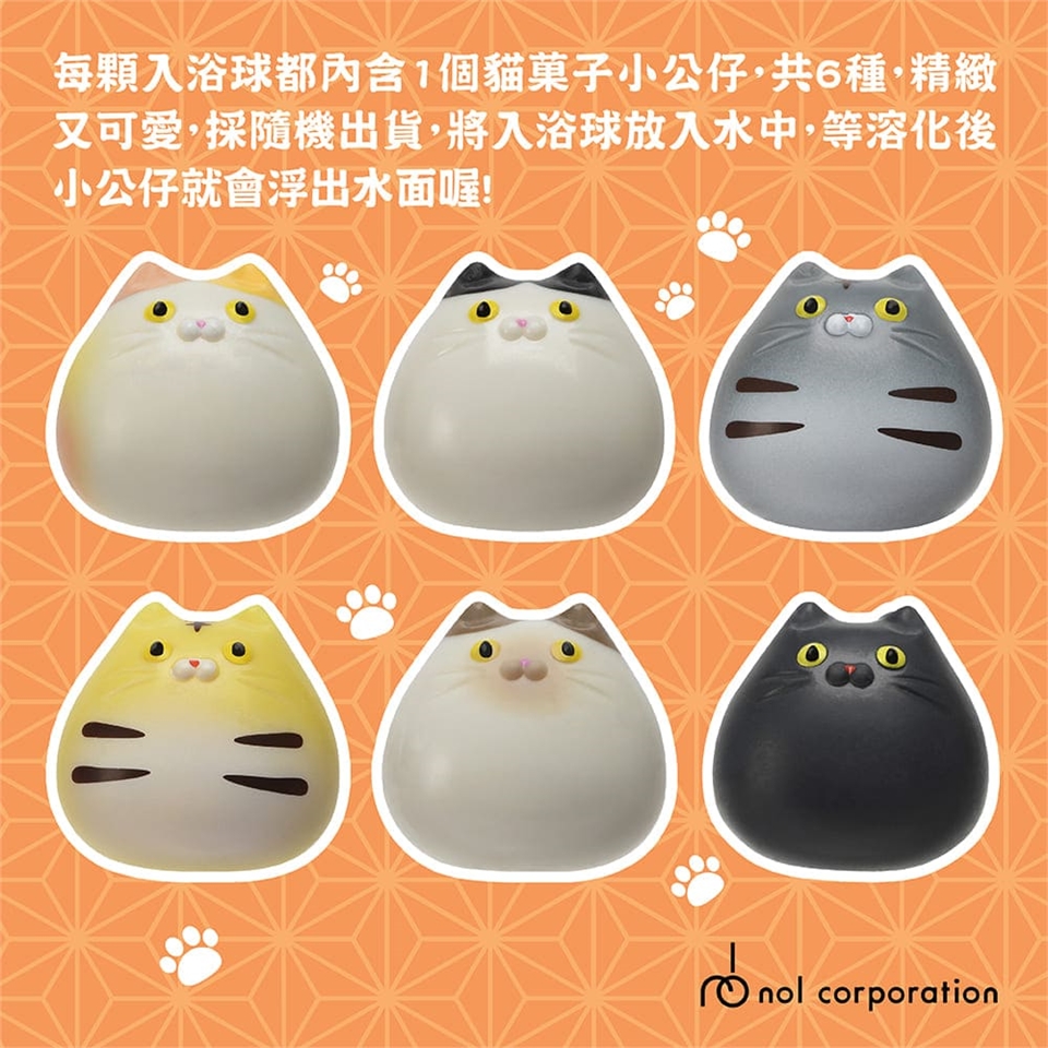 每顆入浴球都內含1個貓菓子小公仔,共6種,精緻又可愛,採隨機出貨,將入浴球放入水中,