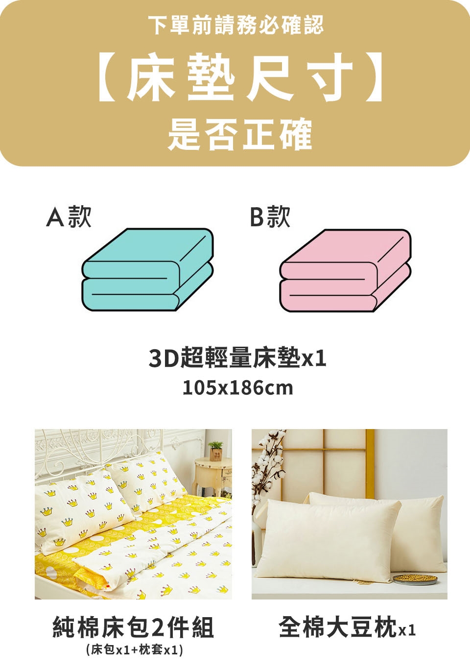【開學4件套組】MIT 3D輕量床墊+純棉床包組+舒眠枕 (單人加大3.5尺)