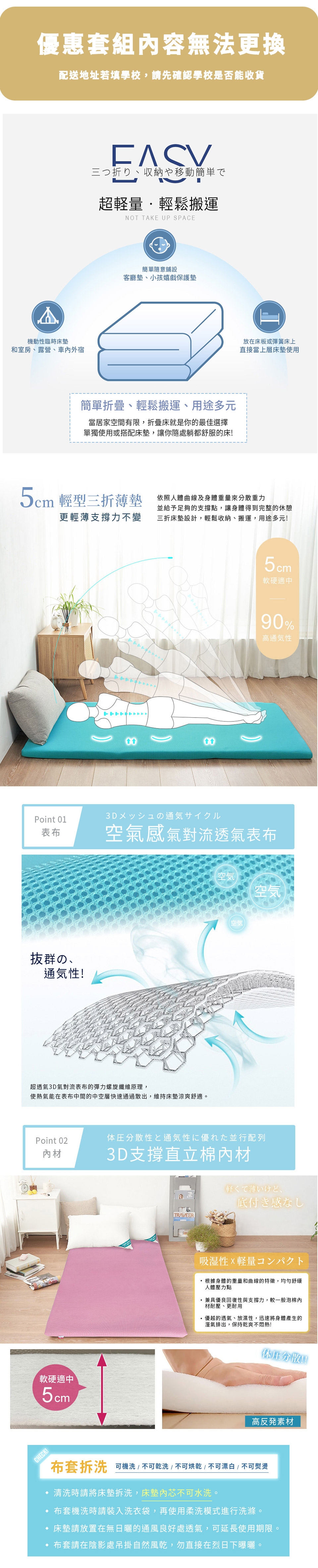 三折式構造床墊,達到可折疊的優勢,重量輕巧更便於收納、搬運。