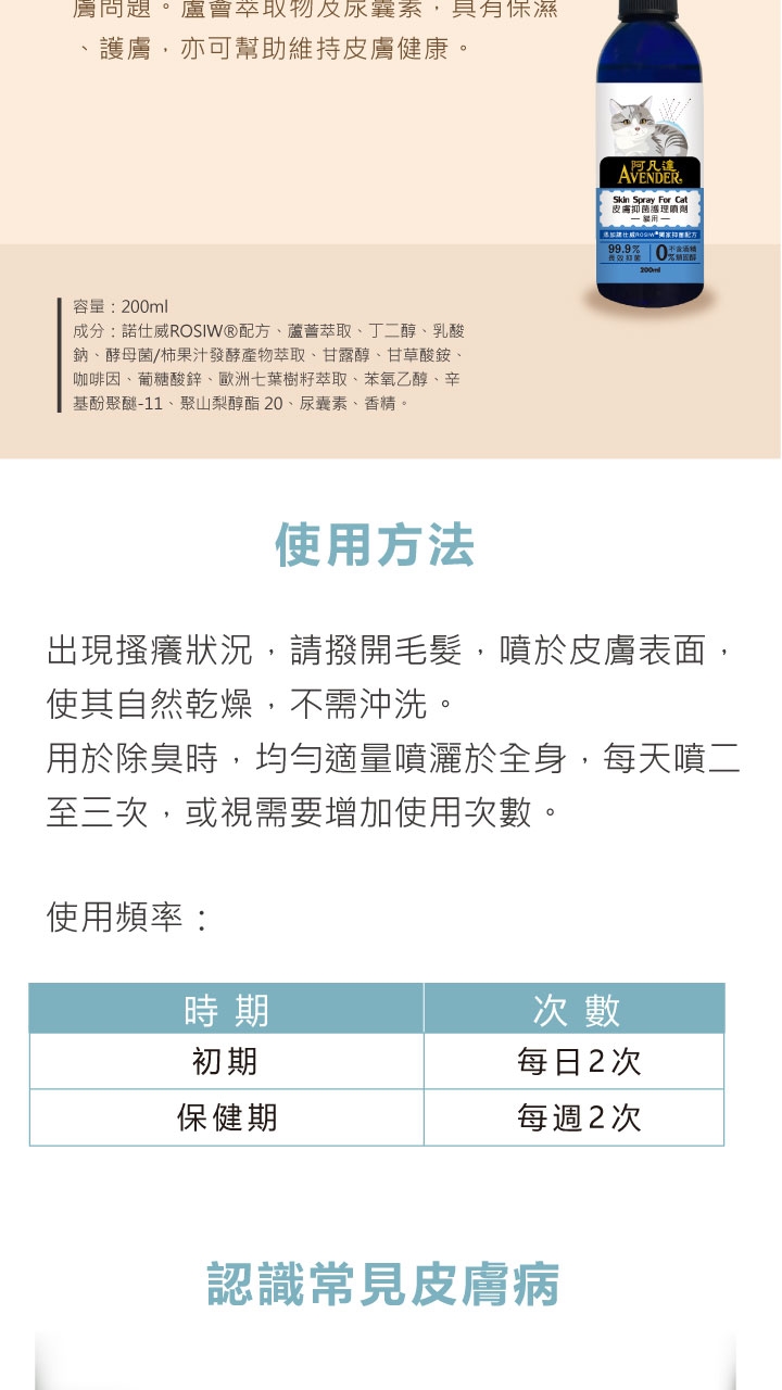 商品詳細介紹 體驗說明 不可體驗 使用方法說明 使用前請務必搖勻,撥開毛髮,避開口鼻,距皮膚適當處均匀適量噴灑於全身,每天噴二至三次,或視需要增加使用次數。 注意事項 僅供貓咪使用。如有異常現象,請停止使用,並洽詢獸醫師