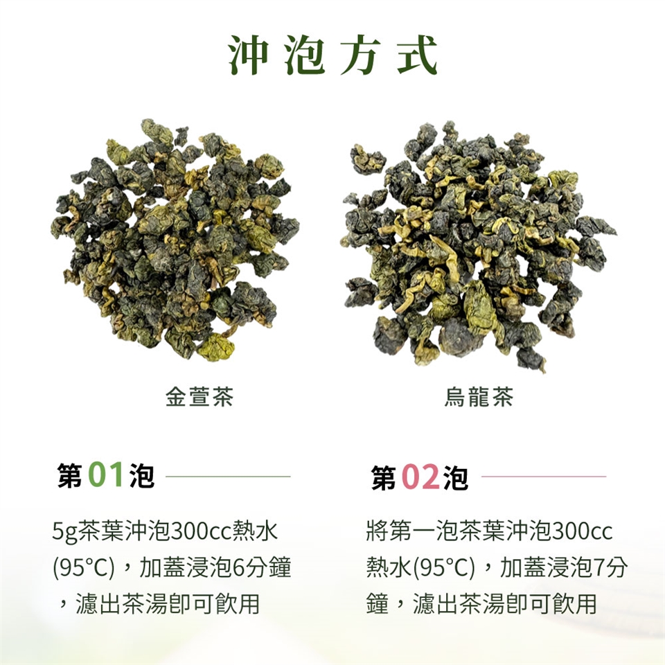 第一泡:5g茶葉沖泡300cc熱水(95℃),加蓋浸泡6分鐘,濾出茶湯即可飲用。