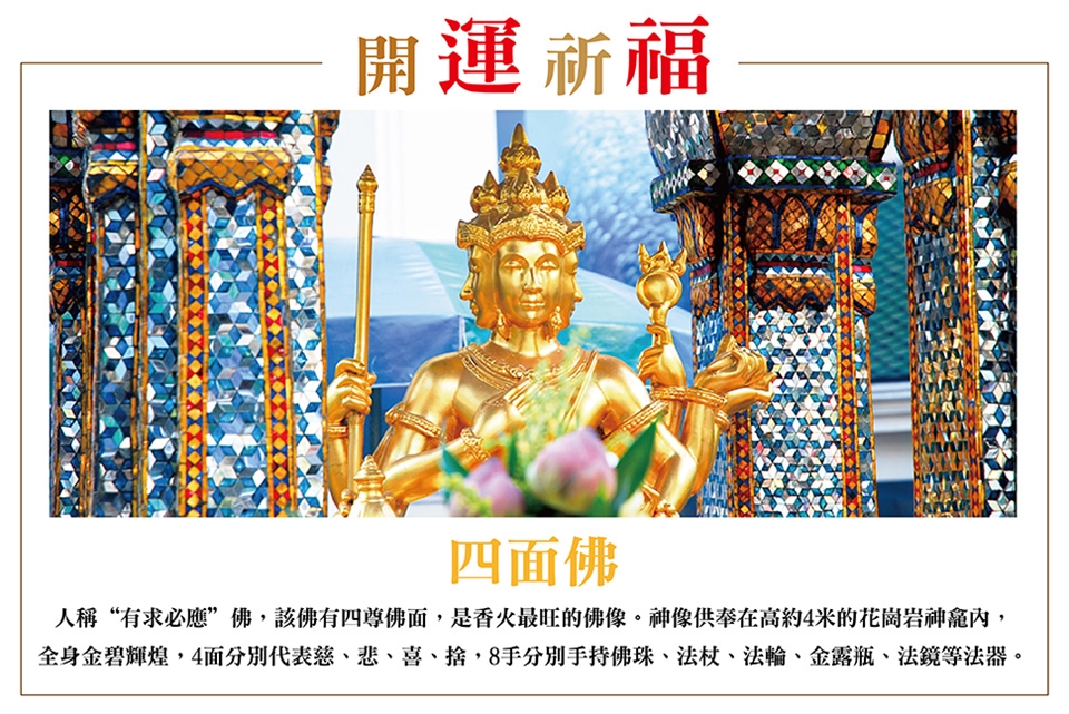 早餐後前往【芭提雅四面佛】人稱“有求必應”佛,該佛有四尊佛面,是香火最旺的佛像。神像供奉在高約4米的花崗岩神龕內,全身金碧輝煌,4面分別代表慈、悲、喜、捨,8手分別手持佛珠、法杖、法輪、金露瓶、法鏡等法器。參拜四面佛一般要有以下祭品:12柱香,4支蠟燭,4串花,拜四面佛要拜足四面,先由正面開始拜祭,順時針轉一圈,每面3枝香,1枝蠟燭,1串花。記得參拜後要還神,以謝神恩,除了以香燭、花串、木象還神外,有的更會請舞蹈員表演還神舞。 早餐:酒店內 午餐:方便遊玩自理 晚餐:遊船海鮮自助 |