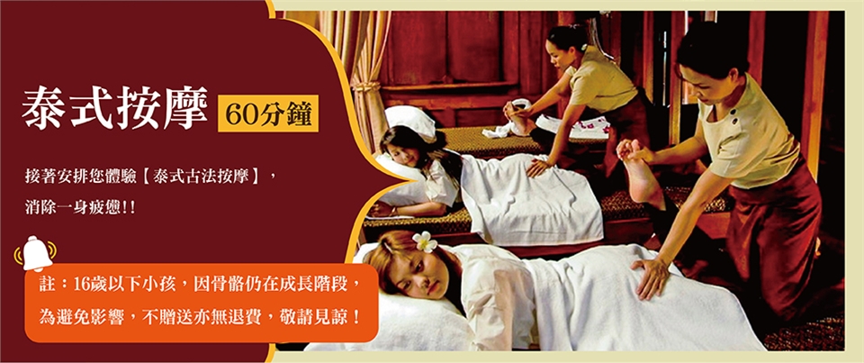 16歲(含)以下小朋友,因骨骼仍在成長階段,為避免影響,不包含SPA、按摩亦無退費,敬請見諒!