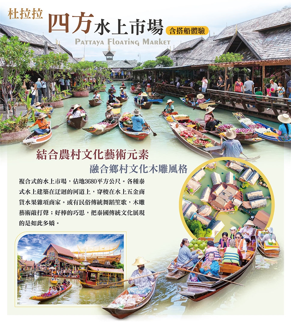 早餐後帶您前往【七珍大佛】傳說這是一個高僧為當今九世皇找的龍脈所在,就著山形剖開一面山,削平山面,依著山用4噸黃金刻了一座大佛,據說是用高科技鐳射畫出打坐佛像,用義大利進口的金鑲嵌線條,金線耀眼,在佛的心臟處藏有釋迦牟尼的舍利。後前往【爽泰渡假莊園11合1(當季水果吃到飽+芒果糯米飯+遊園車園區遊覽+泰國文化表演+騎大象+馬車+潑水節+水燈節體驗+遊船+泰式生活體驗 DIY+泰服體驗)】2018年全新開幕的 泰式莊園,您將感受到泰國全新的景象,獨特的泰國文化氛圍和地道的生活方式。同時,您還可以領略泰國六個地區超過40000平方公尺土地上獨具一格的風土人情。濃濃泰國風就是莊園帶來的感受,特別安排享用美味泰式料理、泰式傳統服裝體驗,以及船遊水上市場,再來體驗泰國特有節慶宋干節與水燈節,以為這樣就結束了嗎 ? 還有可愛大象和馬車等著貴客蒞臨,這麼特別的旅遊經驗,就是要讓您上傳照片打卡,羨煞親朋好友!爾後前往參觀【乳膠睡眠博物館】泰國一職是東南亞乳膠產出大國,館內除展示自古以來人類的起居的睡眠方式外,也有讓旅客參觀購物中心,例如乳膠枕頭/床墊,經久耐用,無毒,放鬆頸肩部肌肉、血管,給予頸部和頭部最好的睡眠支撐,促進睡眠,提高睡眠質量,還可以防蟎抗菌,滿足不同體重人群的需要,緩衝人體壓力,良好的支撐力能夠適應各種睡姿等多種產品可供選購。接著安排您體驗【泰式古法按摩】,消除一身疲憊!! 早餐:酒店內 午餐:帝王手抓飯帝 晚餐:四季歌舞餐廳 |