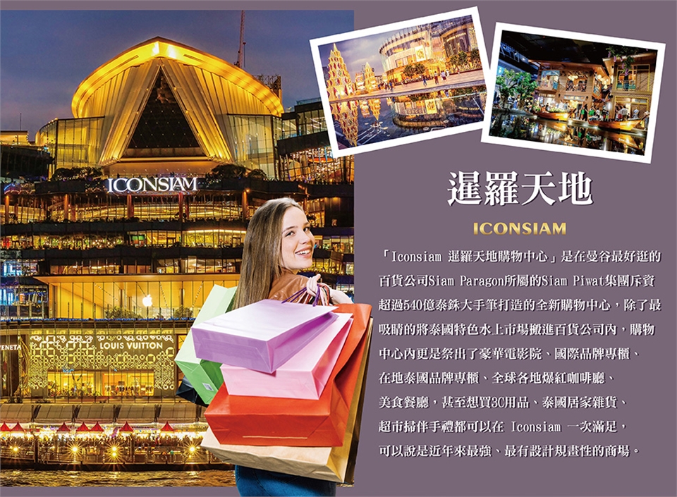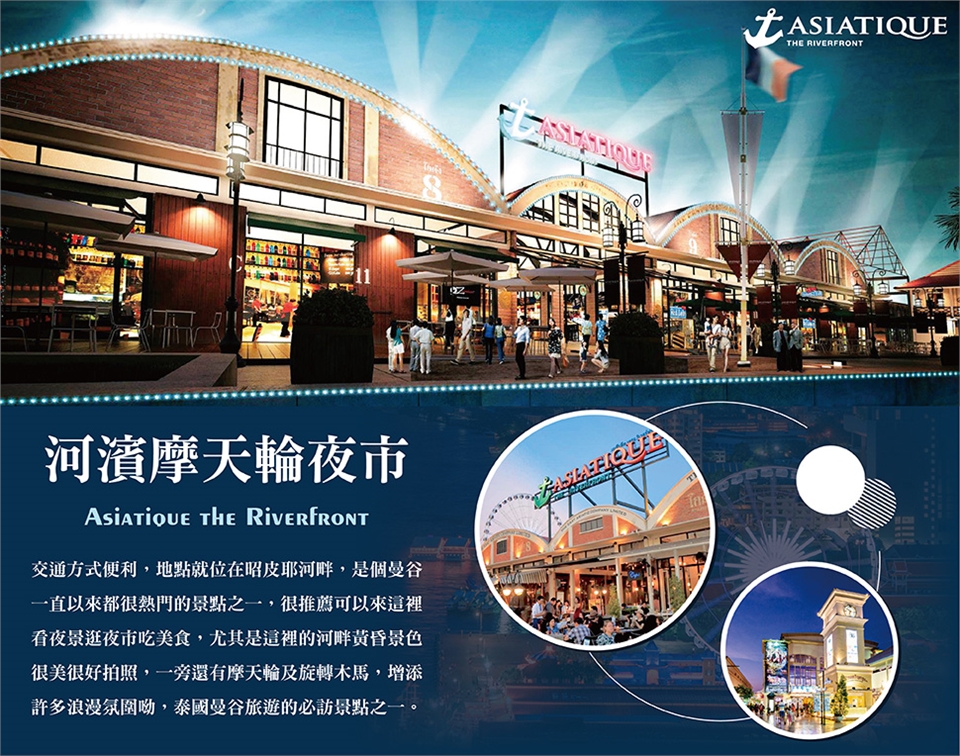 期待已久的假期終於來臨,收拾起旅行包咱們準備度假去吧!我們集合於桃園國際機場後跟隨美女或是帥哥領隊一同出國。搭乘國際航班前往微笑王國之稱的泰國首都~曼谷。當地接待的帥哥或美女導遊們早已經恭候各位嘉賓多時,不囉唆拿著行李趕快跟著與我們相處六天的帥哥、美女導遊走吧!首先前往【暹羅天地】「Iconsiam 暹羅天地購物中心」是在曼谷最好逛的百貨公司Siam Paragon所屬的Siam Piwat集團斥資超過540億泰銖大手筆打造的全新購物中心,除了最吸睛的將泰國特色水上市場搬進百貨公司內,購物中心內更是祭出了豪華電影院、國際品牌專櫃、在地泰國品牌專櫃、全球各地爆紅咖啡廳、美食餐廳,甚至想買3C用品、泰國居家雜貨、超市掃伴手禮都可以在 Iconsiam 一次滿足,可以說是近年來最強、最有設計規畫性的商場。續前往泰國曼谷必去夜市絕對不能錯過【Asiatique河濱碼頭摩天輪夜市】,交通方式便利,地點就位在昭皮耶河畔,是個曼谷一直以來都很熱門的景點之一,很推薦可以來這裡看夜景逛夜市吃美食,尤其是這裡的河畔黃昏景色很美很好拍照,一旁還有摩天輪及旋轉木馬,增添許多浪漫氛圍呦。也有不少好吃美食餐廳及當地小吃,部分區域的裝置藝術更增添了許多文青風格,整體環境規劃的不錯,逛起來挺舒適,很推薦第一次來泰國曼谷旅遊的必訪景點之一。 早餐:X 午餐:X 晚餐:機上 |