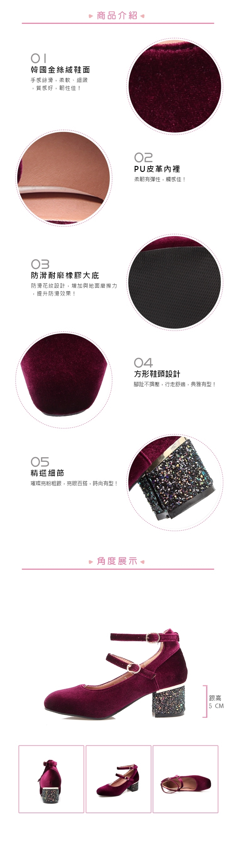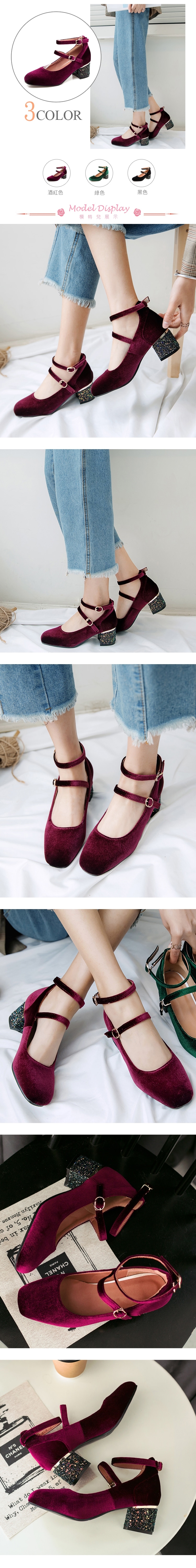 【KISSXXX】方頭繫帶亮粉粗跟鞋/方頭繫帶質感金絲絨璀璨亮粉粗跟鞋 女鞋 酒紅