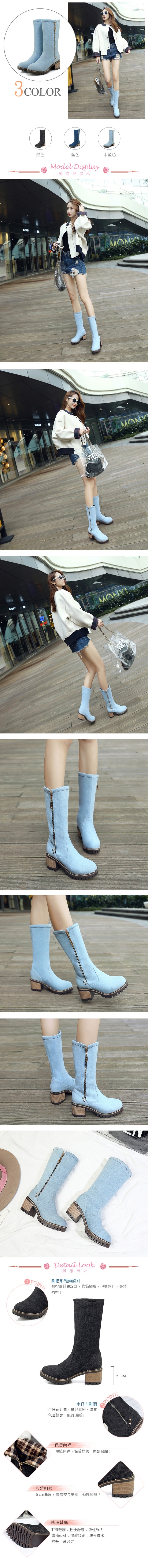 【KISSXXX】純色牛仔粗跟中筒靴 /百搭時尚純色牛仔帥氣粗跟中筒靴 女鞋 水藍