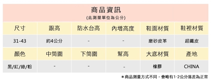 2.鞋類商品依功能及用途之不同,鞋底各有其止滑係數之個別不同,使用鞋類商品請用於正常平坦之路面,非雨鞋或雨靴類商品,請避免穿著於下雨濕滑路面上行走。