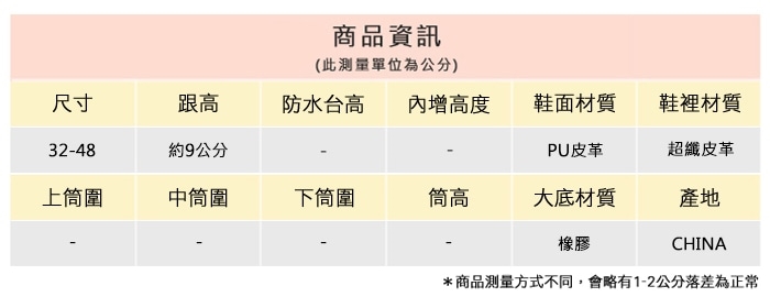 2.鞋類商品依功能及用途之不同,鞋底各有其止滑係數之個別不同,使用鞋類商品請用於正常平坦之路面,非雨鞋或雨靴類商品,請避免穿著於下雨濕滑路面上行走。