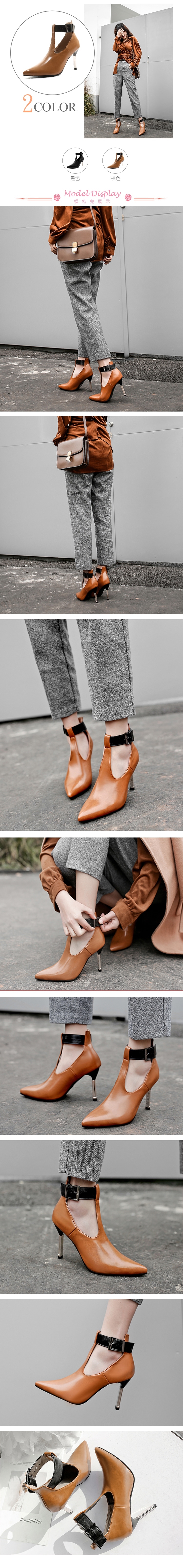【KISSXXX】尖頭T字美腿高跟鞋/性感尖頭T字釦帶金屬跟造型美腿效果高跟鞋 女鞋 棕