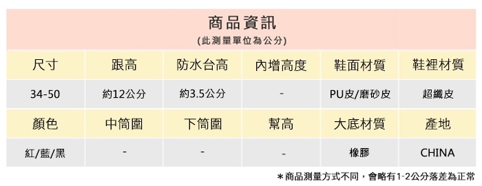 2.鞋類商品依功能及用途之不同,鞋底各有其止滑係數之個別不同,使用鞋類商品請用於正常平坦之路面,非雨鞋或雨靴類商品,請避免穿著於下雨濕滑路面上行走。