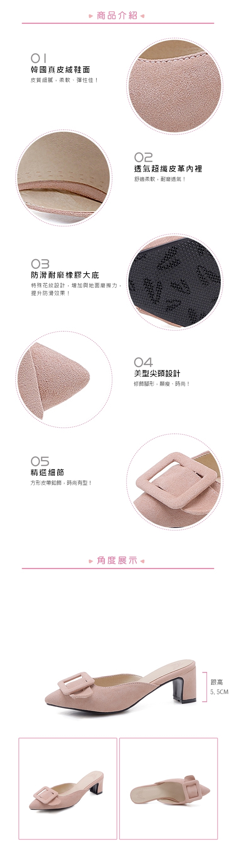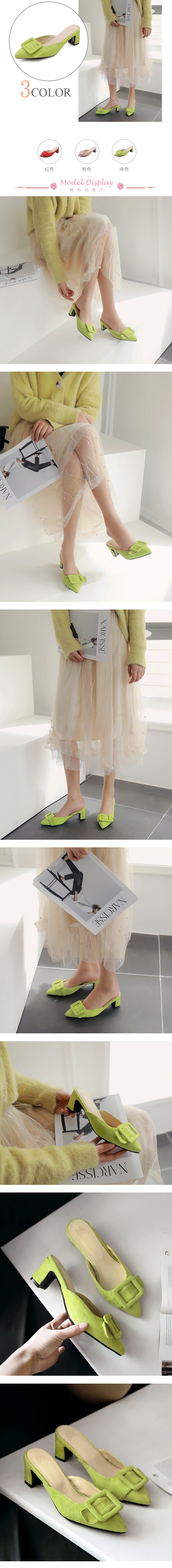 【KISSXXX】純色絨面尖頭粗跟拖鞋/純色絨面方形皮帶釦飾尖頭淺口粗跟拖鞋 女鞋 綠