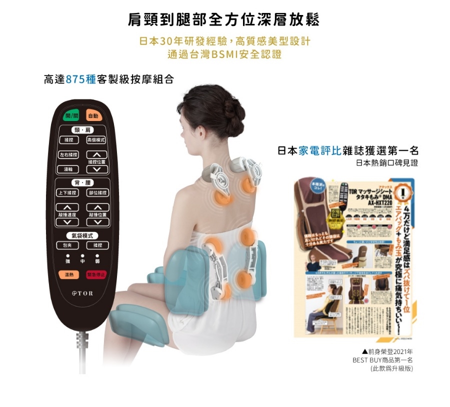 肩頸遙控升降10公分,腰背升降達18公分