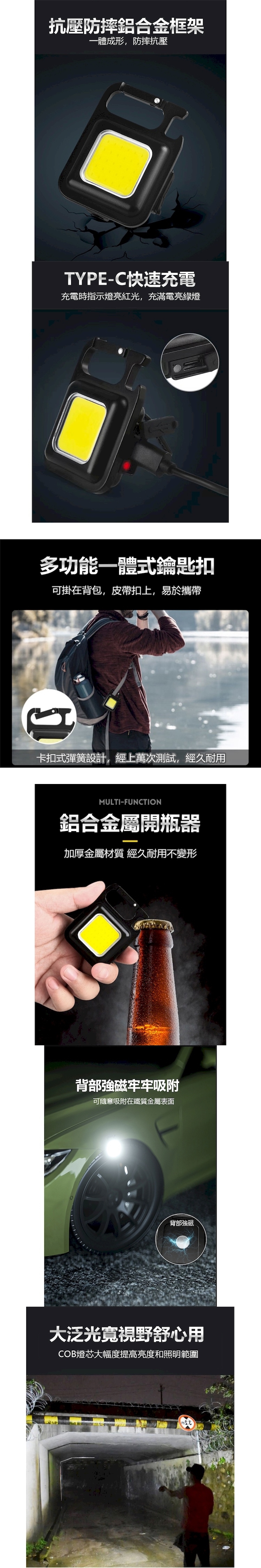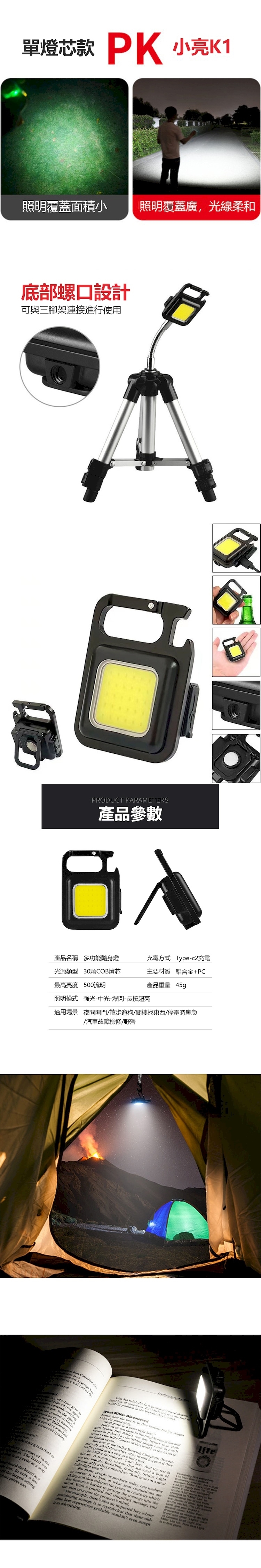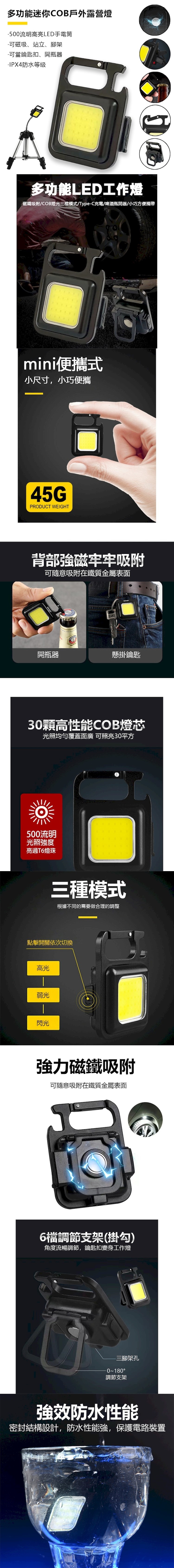 亮度達500流明,三段亮度調整,照明面積廣泛,IPX4防水等級,背部附有強力磁鐵,可立可掛可吸,底部腳架孔,方便接於三腳架,多功能卡扣設計,可當鑰匙扣/開瓶器等,重量輕巧好攜帶