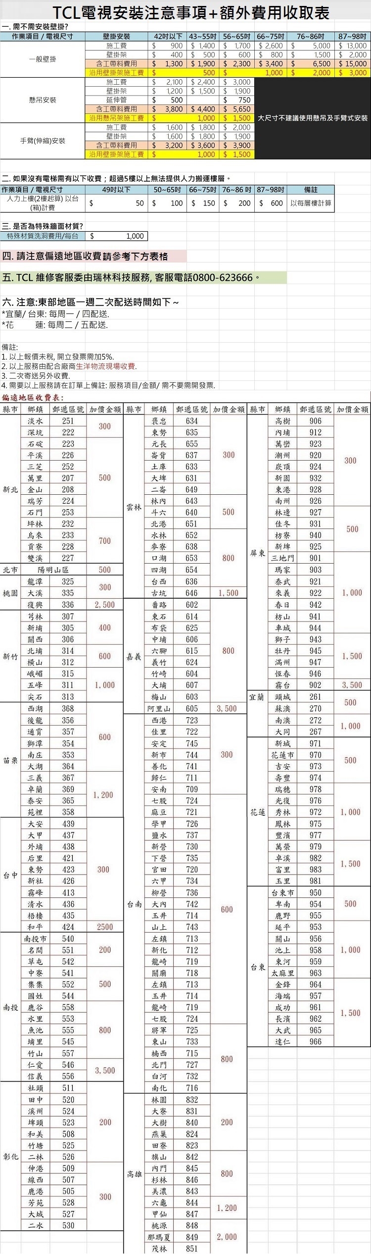 注意:大尺寸電視需先場刊,後續只要有安裝TCL電視(55吋-98吋)無須支付場刊費,若場刊完未購買TCL電視需支付840元場刊費。