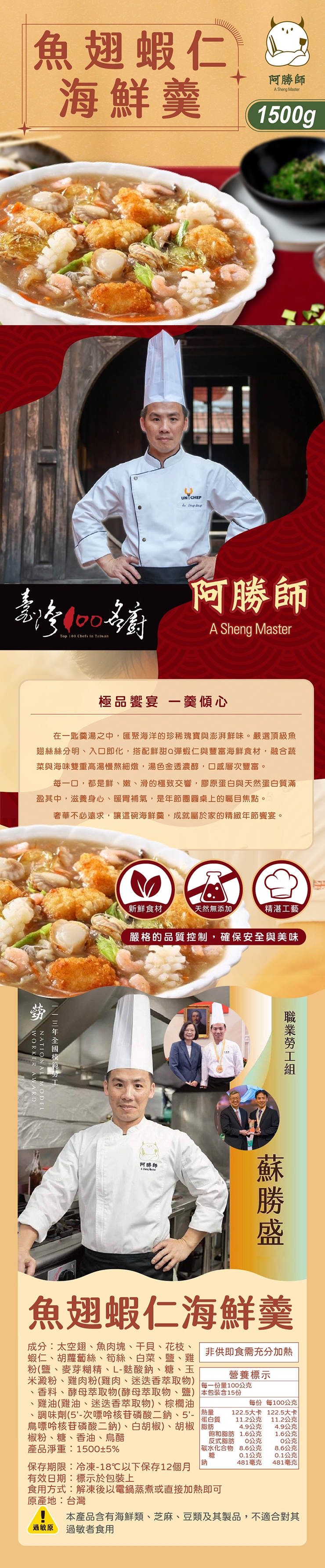 過敏原:本產品含有海鮮類、芝麻、豆類及其製品,不適合對其過敏者食用