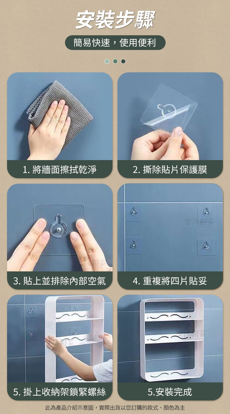 6.商品:免打孔壁掛瓶罐收納置物架三層*1、貼片*4