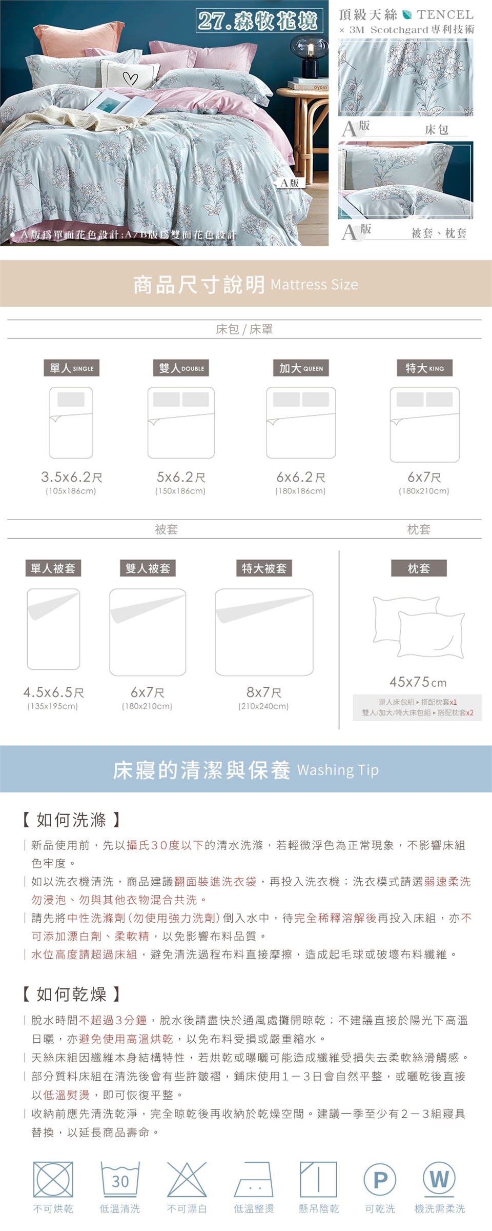 不可漂白、乾洗,並定期日曬達到消毒除溼效果