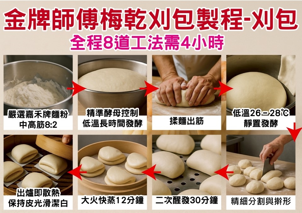 嚴選台灣豬五花,搭配客家梅干菜,經過慢火燉煮,入口即化、鹹香甘醇。刈包Q彈鬆軟,口感升級