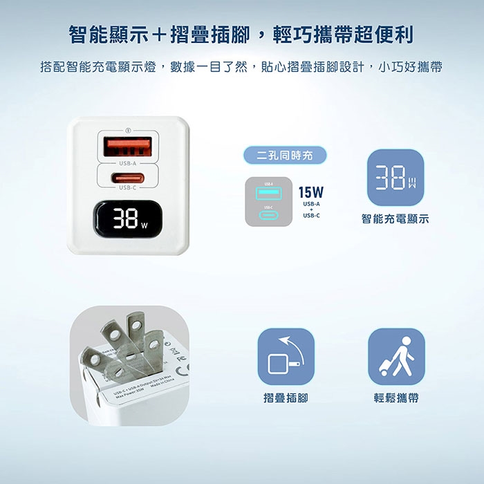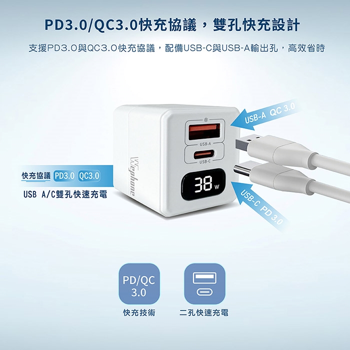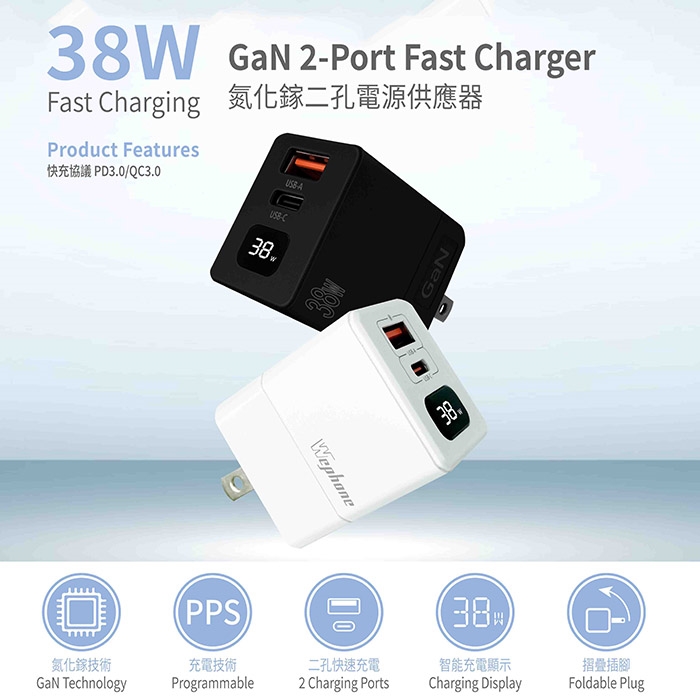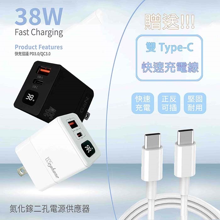 【Wephone】GaN氮化鎵38W 數字顯示雙孔快速充電器(附贈Type-C充電線)