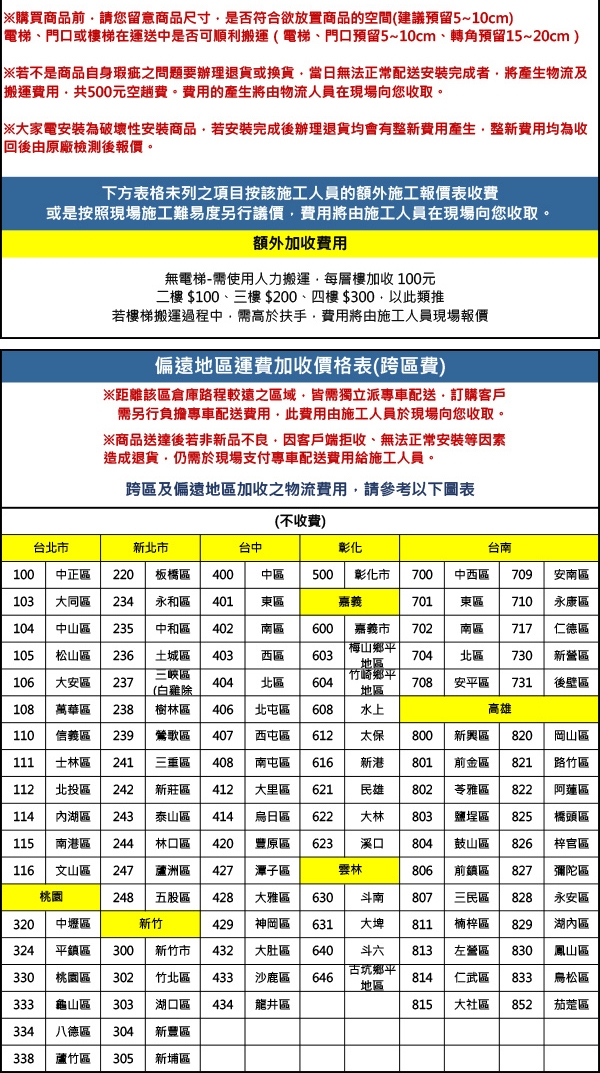 ※商品配送若有如協助搬運上樓等額外施工,配送人員將會現場報價,額外收取費用(現場收取)