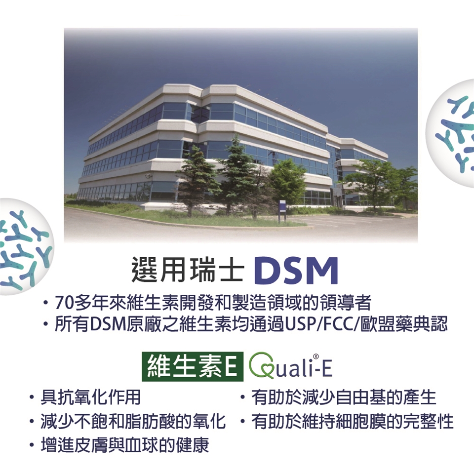 又稱「生育醇」,具抗氧化作用,有助於減少自由基的產生,減少不飽和脂肪酸的氧化,有助於維持細胞膜的完整性、增進皮膚與血球的健康。
