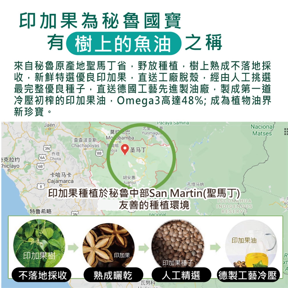 來自秘魯原產地聖馬丁省無農藥莊園野放種植,樹上熟成不落地採收,新鮮特選優良印加果種子,直送工廠脫殼,經由人工挑選最完整優良種子,以德國先進製油設備,低溫慢壓初榨,全程不超過37°C,整個過程無任何溶劑或添加物,氮氣充填保鮮,Omega 3高達48%,通過ISO、GMP、HACCP等多項國際認證。