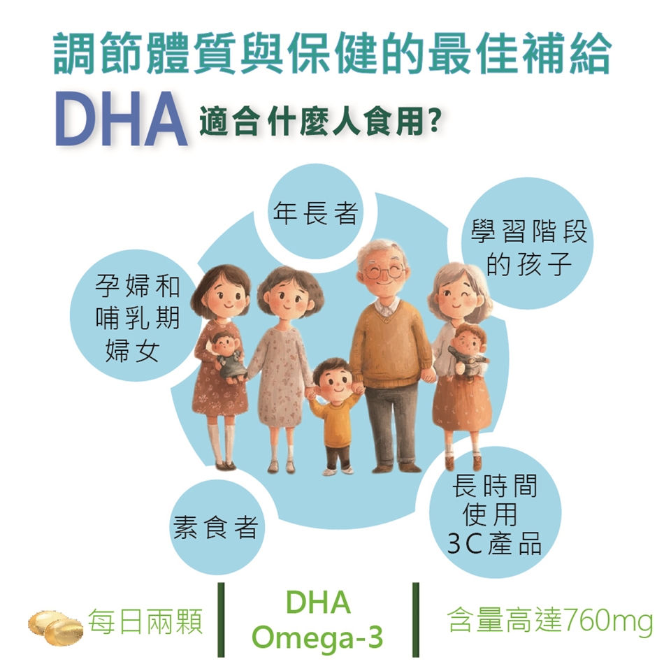 對於孩童、孕期與哺乳中的女性、年長者、素食或菇素飲食者、長時間使用 3C 產品者,以及日常飲食攝取不均衡者,DHA 藻油是最佳補給。