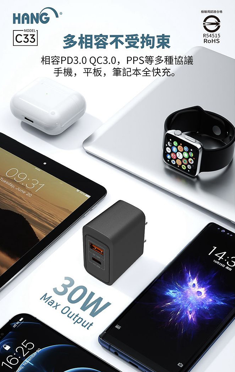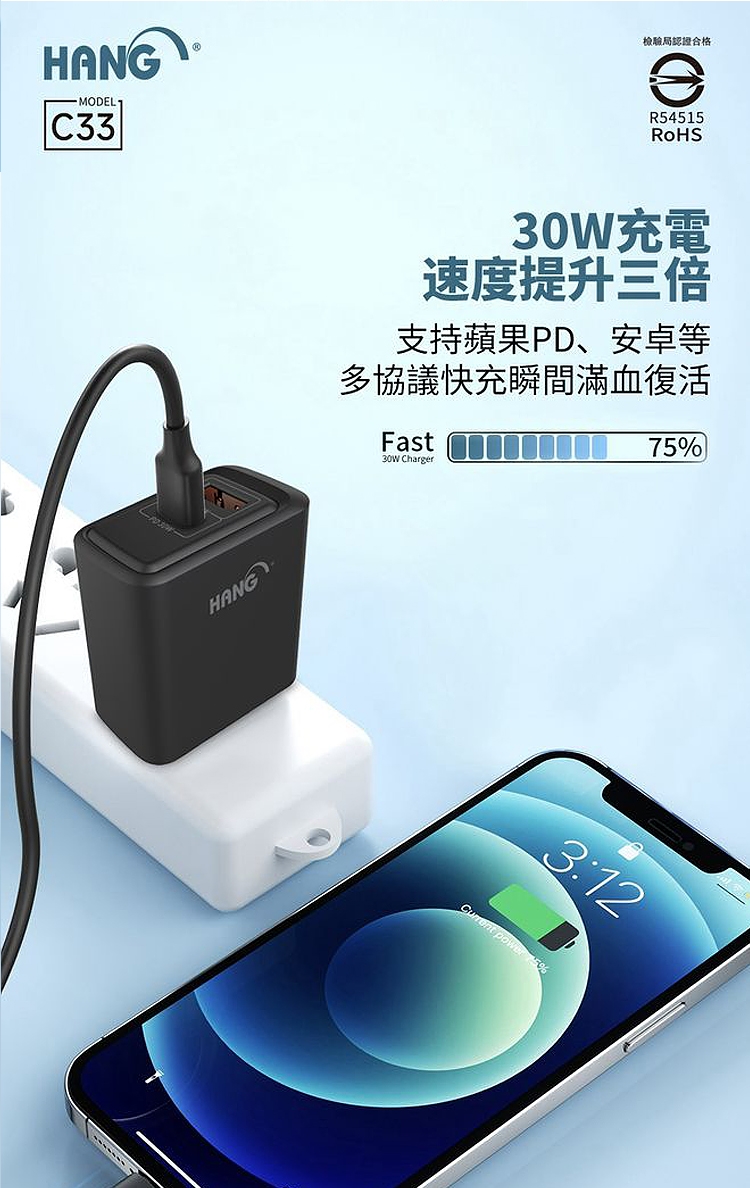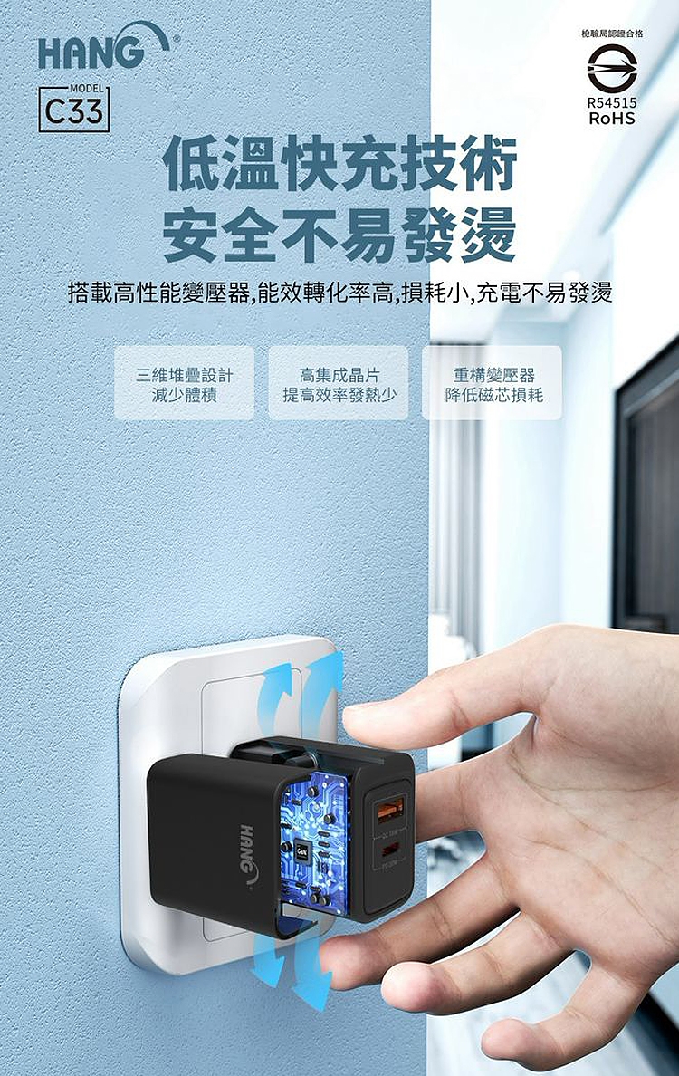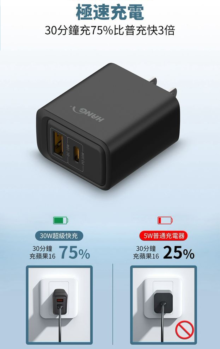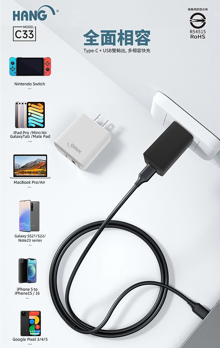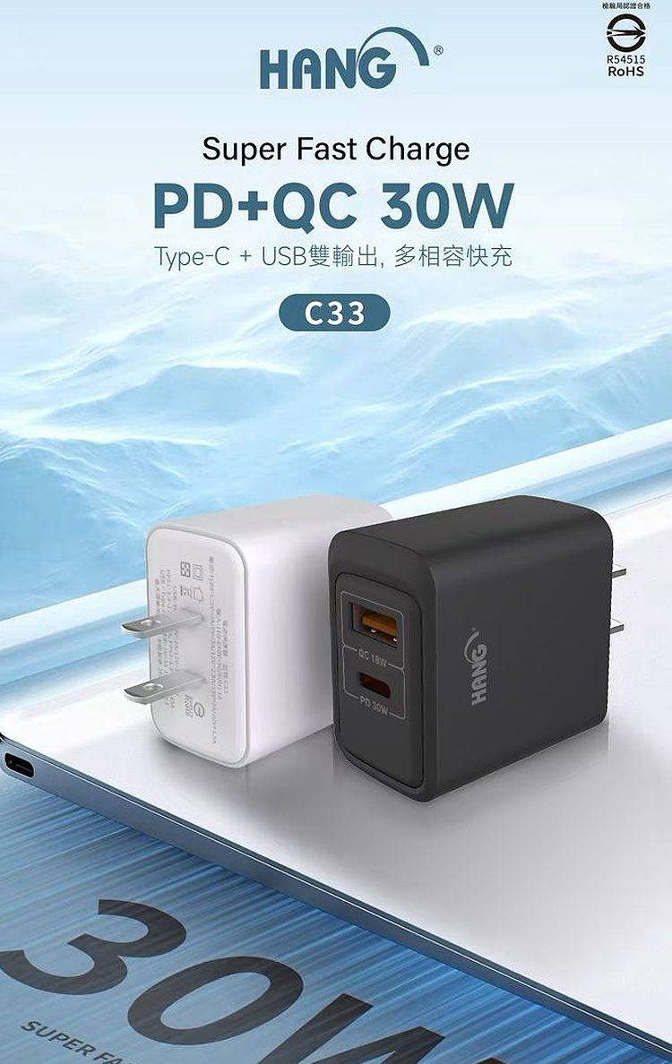 HANG for C33 GaN氮化鎵 30W PD+QC 雙口輸出充電器