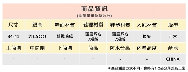 2.鞋類商品依功能及用途之不同,鞋底各有其止滑係數之個別不同,使用鞋類商品請用於正常平坦之路面,非雨鞋或雨靴類商品,請避免穿著於下雨濕滑路面上行走。