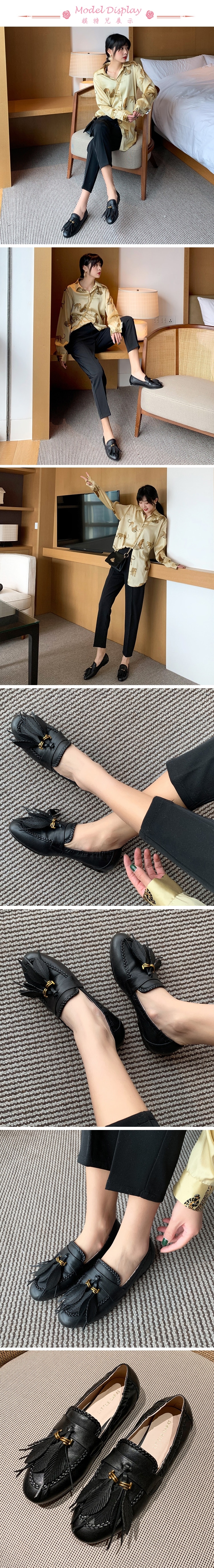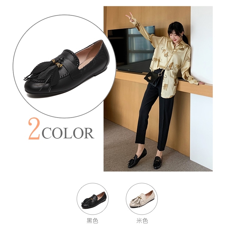 【Kissxxx】真皮麻花邊流蘇樂福鞋/真皮頭層牛皮時尚麻花邊一字帶唯美羽毛流蘇造型時尚樂福鞋 女鞋 黑